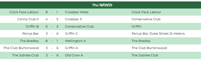 Griffin A made it a clean sweep for the Griffin sides this week, defeating The Club, Burtonwood away 6–3 .