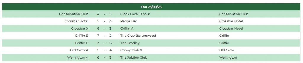 Three teams remain unbeaten — Clock Face Labour, Crossbar X, and Old Crow A — setting the pace with perfect records. Right behind them, The Bradley, Griffin B, Crossbar, and Wellington A are all within striking distance. Further down the table, Perrys Bar, The Jubilee Club, and The Club Burtonwood are still searching for their first points.